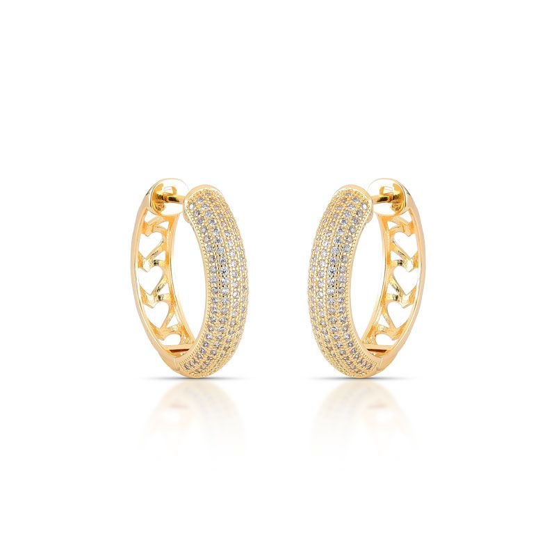 ARGOLA MÉDIA BANHADA EM OURO 18K COM A FRENTE CRAVEJADA COM PEDRAS ZIRCÔNIAS E, ATRÁS DETALHES VAZADOS EM FORMA DE CORAÇÕES