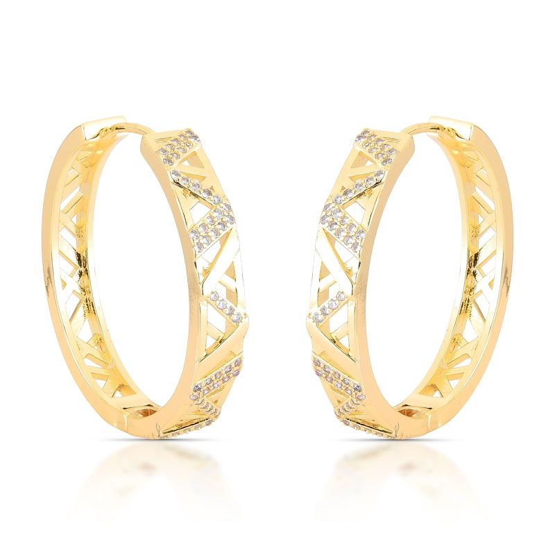ARGOLA GRANDE BANHADA EM OURO 18K COM DETALHES GEOMÉTRICOS VAZADOS E CRAVEJADOS C/ PEDRAS ZIRCÔNIAS