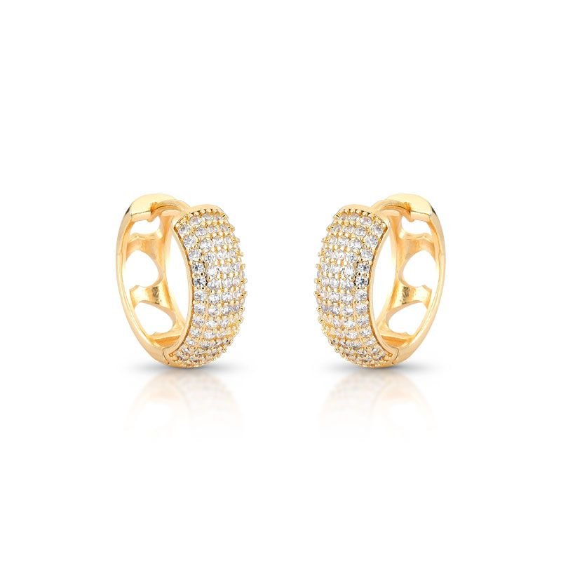 BRINCO ARGOLA CLICK MÉDIO COM PEDRAS CRAVEJADAS ZIRCÔNIAS TRANSPARENTES E DETLHE NA PARTE DETRÁS CORAÇÕES VAZADOS BANHADO EM OURO 18K