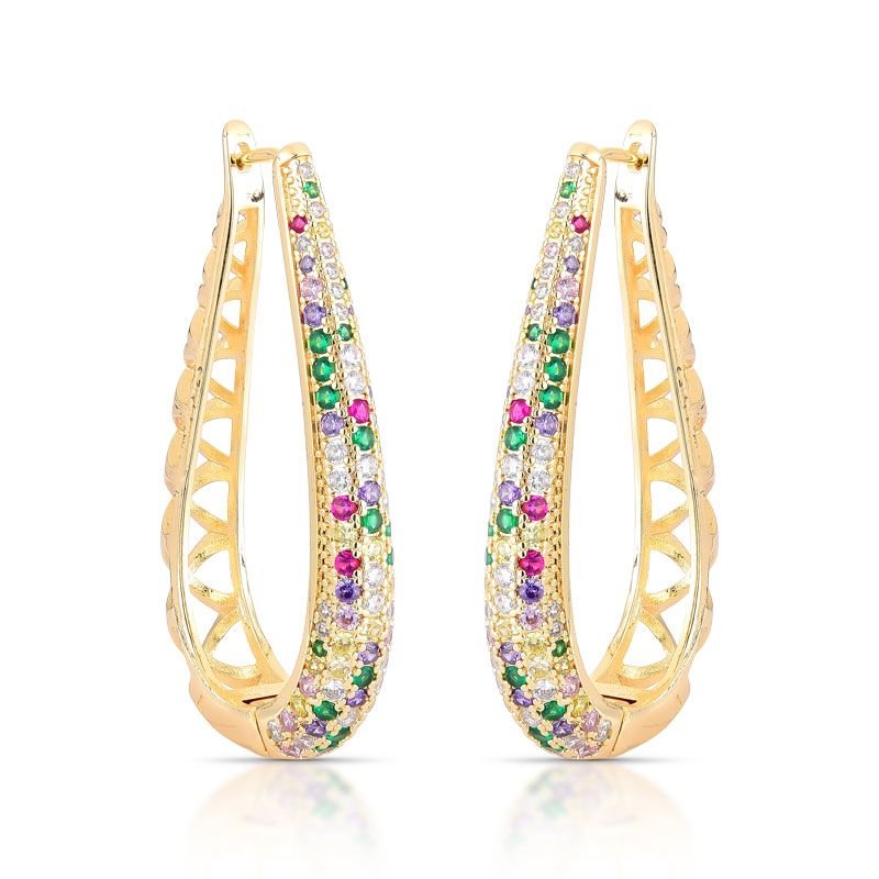 ARGOLA EM FORMATO DE GOTA COM DETALHES VAZADOS, BANHADA EM OURO 18K E CRAVEJADA COM PEDRAS ZIRCÔNIAS COLORIDAS