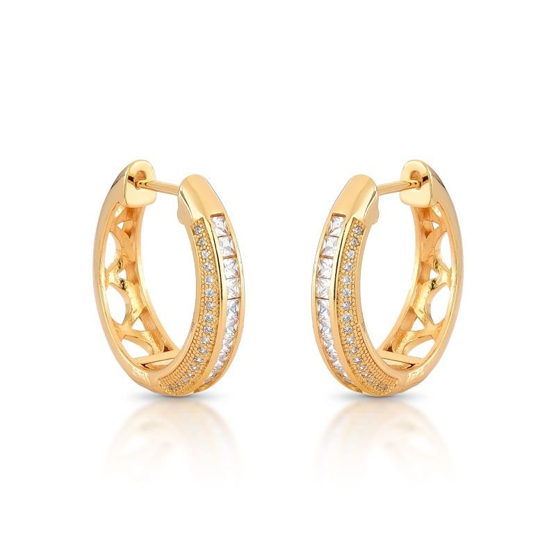 BRINCO ARGOLA COM PEDRAS CRAVEJADAS ZIRCÔNIAS E DETALHES VAZADOS NA PARTE DETRÁS BANHADO EM OURO 18K