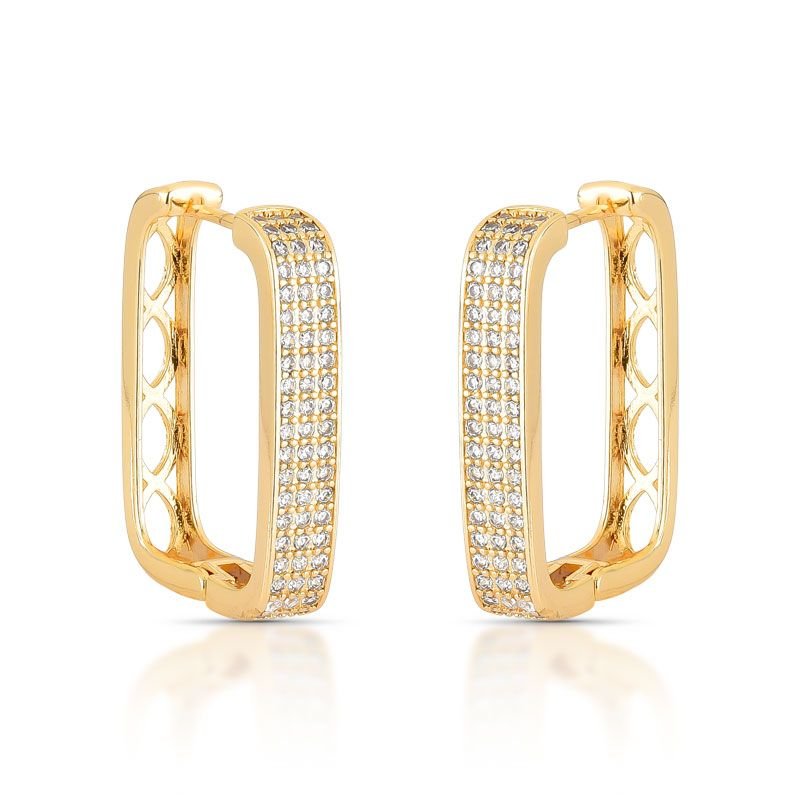 ARGOLA GRANDE QUADRADA, BANHADA EM OURO 18K COM PEDRAS ZIRCÔNIAS NA FRENTE E DETALHES VAZADOS ATRÁS