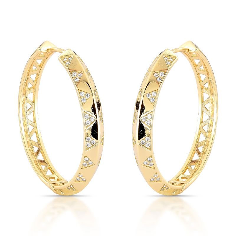 ARGOLA GRANDE COM DETALHES EM FORMA DE TRIÂNGULO CRAVEJADOS COM PEDRAS ZIRCÔNIAS E BANHADA EM OURO 18K