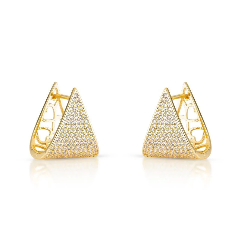 BRINCO ARGOLA TRIÂNGULO COM PEDRAS CRAVEJADAS ZIRCÔNIAS TRANSPARENTES COM CORAÇÕES VAZADOS NA PARTE DETRÁS BANHADO EM OURO 18K