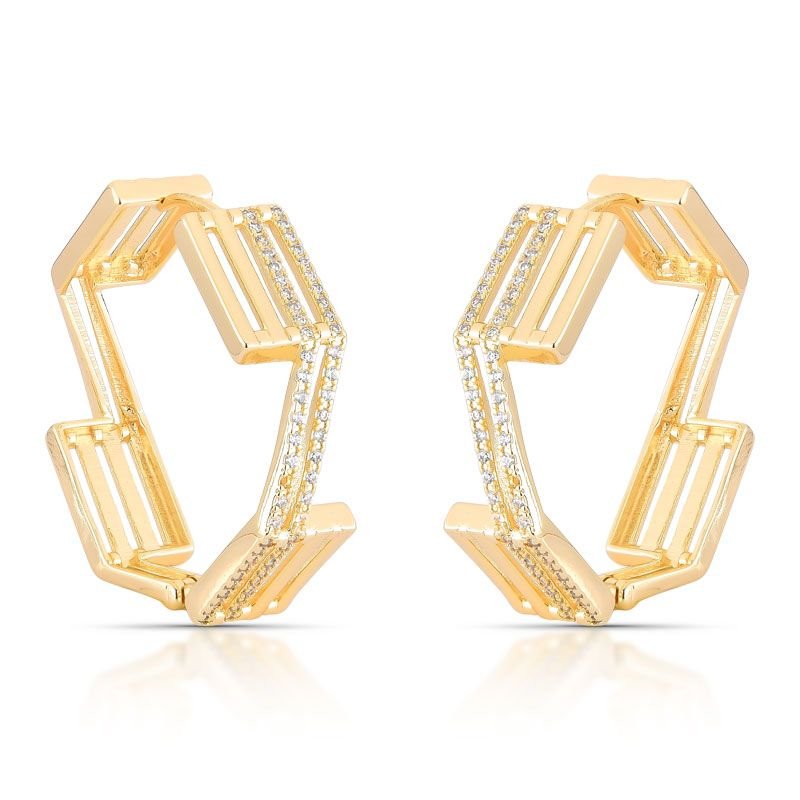 ARGOLA VAZADA BANHADA EM OURO 18K CRAVEJADA COM DETALHES GEOMÉTRICOS E PEDRAS ZIRCÔNIAS