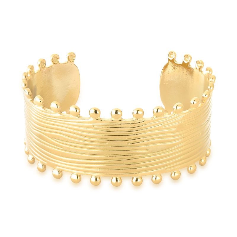 BRACELETE ABERTO EM AÇO BANHADO EM OURO 18K COM DETALHES EM TEXTURAS E BOLINHAS NAS LATERAIS