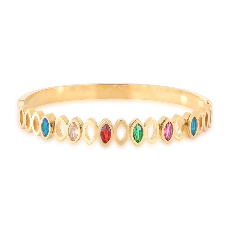 BRACELETE PÉTALAS LISO FINO AÇO BANHADO EM OURO 18K COM PEDRAS COLORIDAS