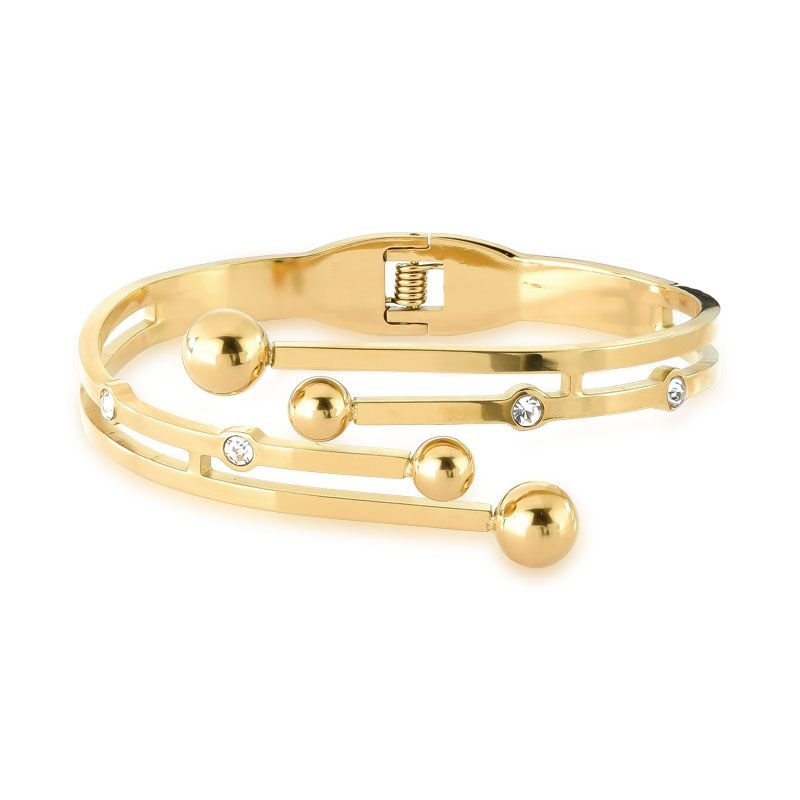 BRACELETE LISO VAZADO COM PEDRAS TRANSPARENTES E BOLINHAS EM AÇO BANHADO EM OURO 18K