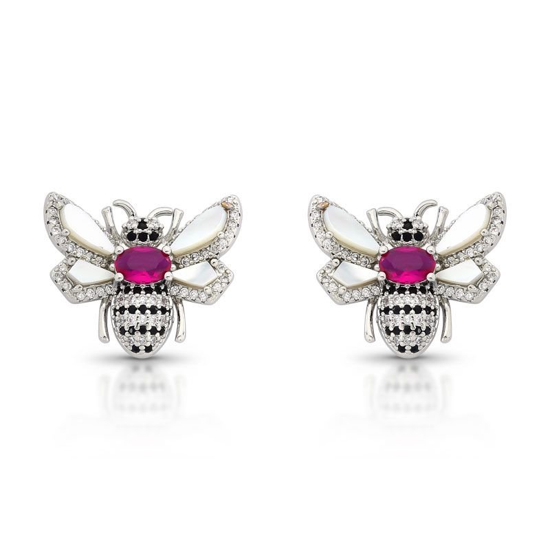 BRINCO ABELHA CRAVEJADO COM ZIRCÔNIAS PEDRA RUBI BANHADO EM RÓDIO BRANCO