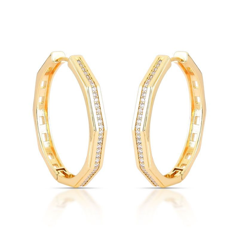 BRINCO ARGOLA DETALHES RETOS BANHADO EM OURO 18K COM PEDRAS CRAVEJADAS E DETALHES VAZADOS