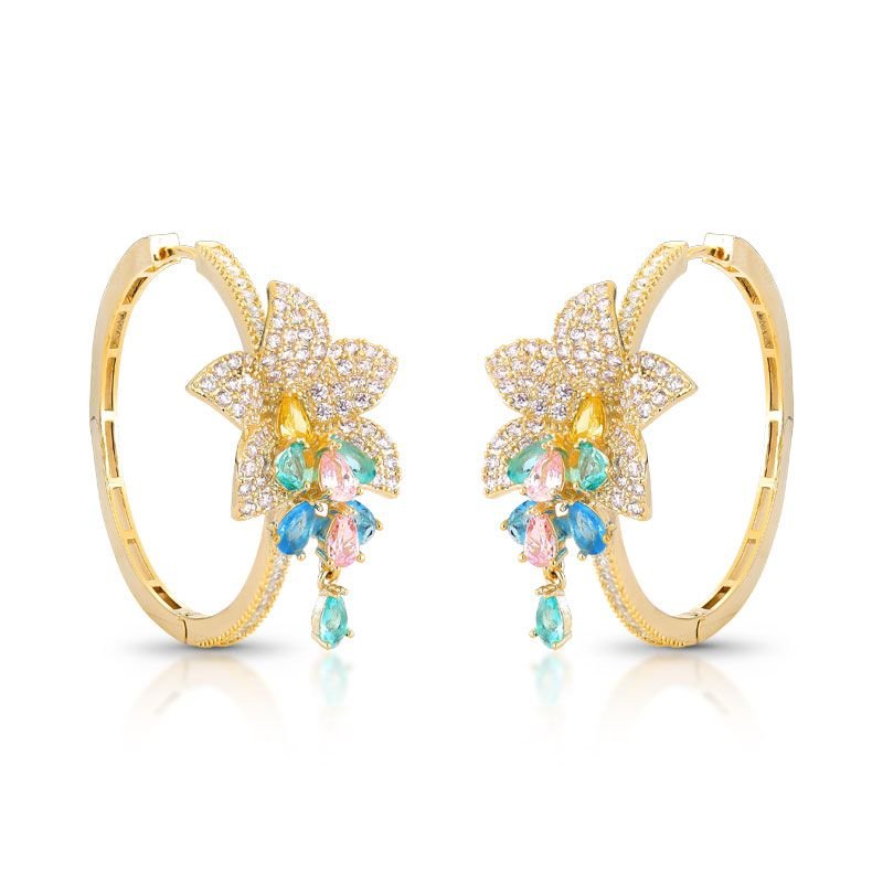 BRINCO ARGOLA FLOR CRAVEJADA COM PEDRAS ZIRCÔNIAS BANHADO EM OURO 18K