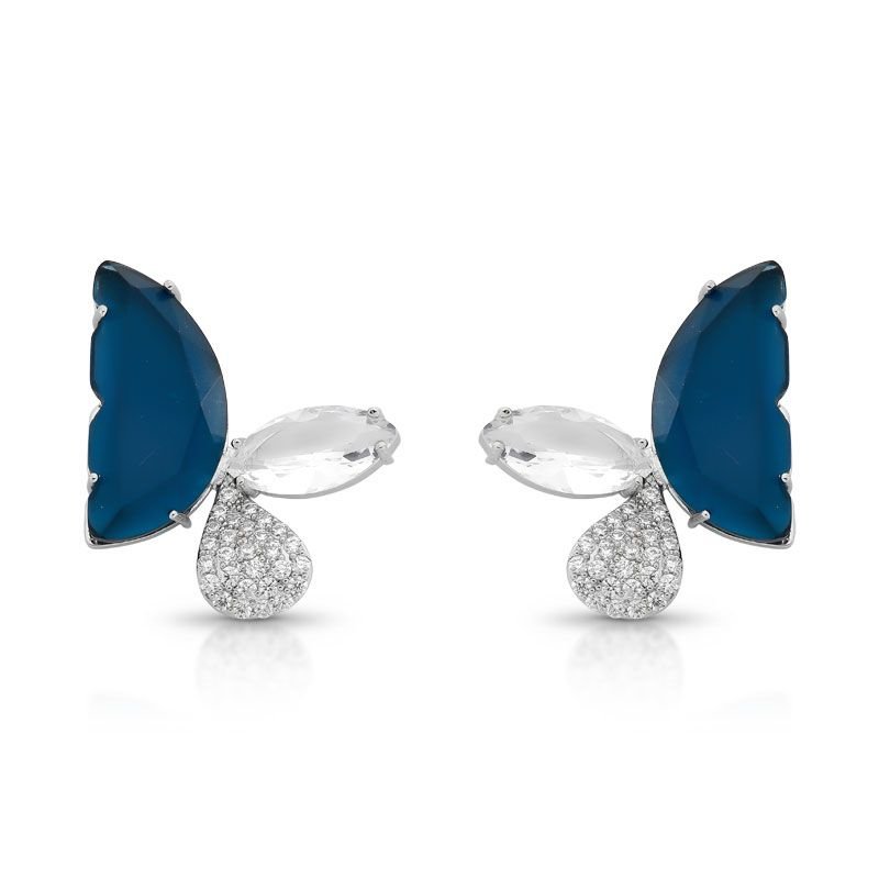 BRINCO BORBOLETA COM PEDRA CRAVEJADA AZUL BANHO DE RÓDIO