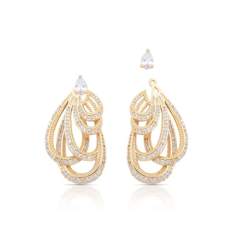 BRINCO EAR JACKET 2 EM 1 PONTO LUZ FESTA DOURADO COM PEDRAS CRAVEJADAS ZIRCÔNIAS BANHADO EM OURO 18K