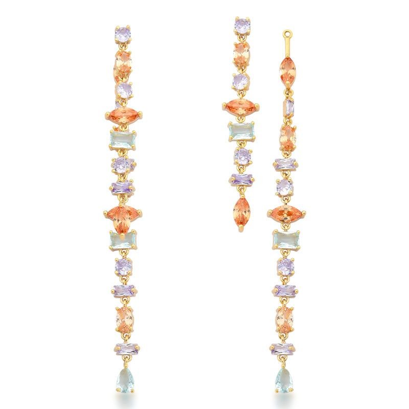 BRINCO EAR JACKET LONGO BANHADO EM OURO 18K COM PEDRAS CRAVEJADAS ZIRCÔNIAS COLORIDAS