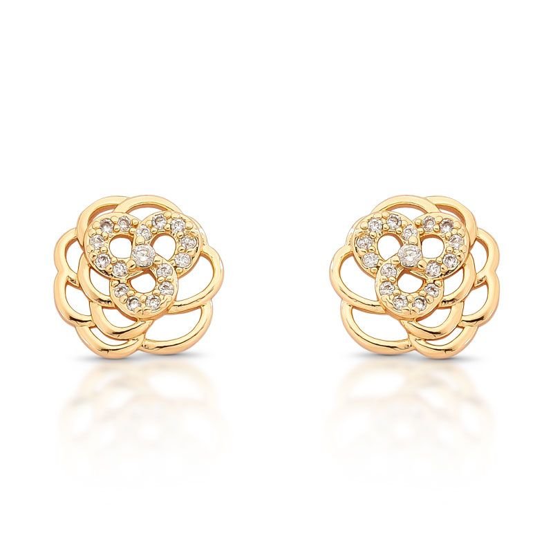 BRINCO EM FORMATO DE FLOR BANHADO EM OURO 18K COM PÉTALA CENTRAL, CRAVEJADA COM PEDRAS ZIRCÔNIAS
