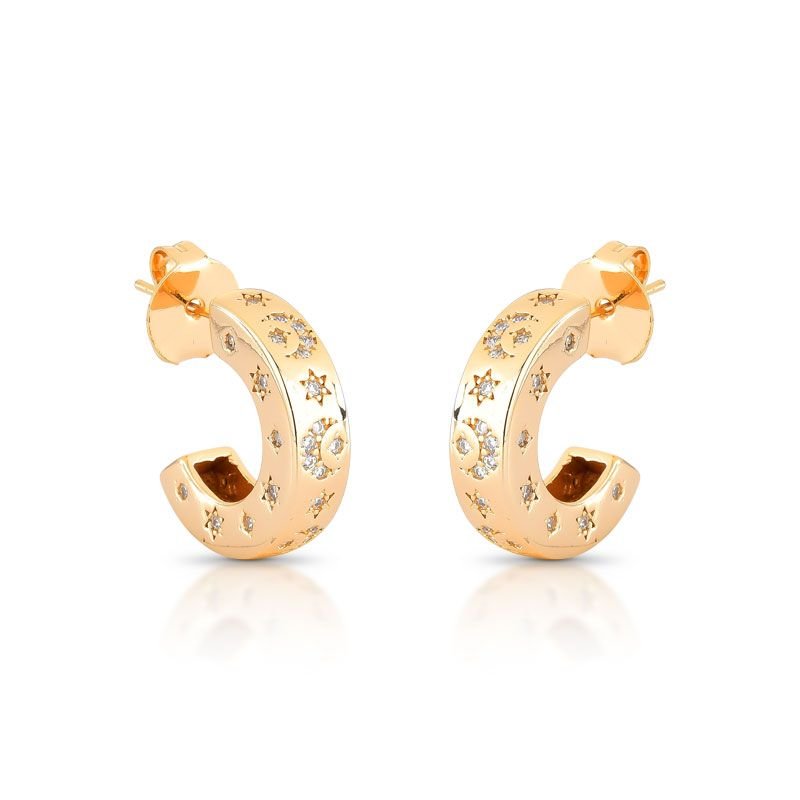 BRINCO COM DETALHES EM FORMATO DE LUA/ESTRELA CRAVEJADOS COM PEDRAS ZIRCÔNIAS E BANHADO EM OURO 18K