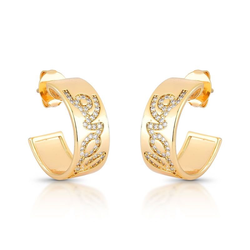 BRINCO MEIA ARGOLA COM PEDRAS CRAVEJADAS ZIRCÔNIAS PALAVRA LOVE BANHADO EM OURO 18K