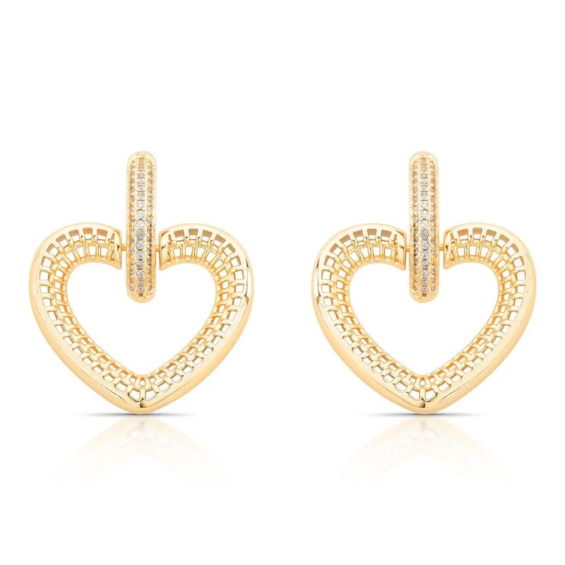 BRINCO PINGENTE CORAÇÃO VAZADO COM PEDRAS CRAVEJADAS ZIRCÔNIAS BANHADO EM OURO 18K