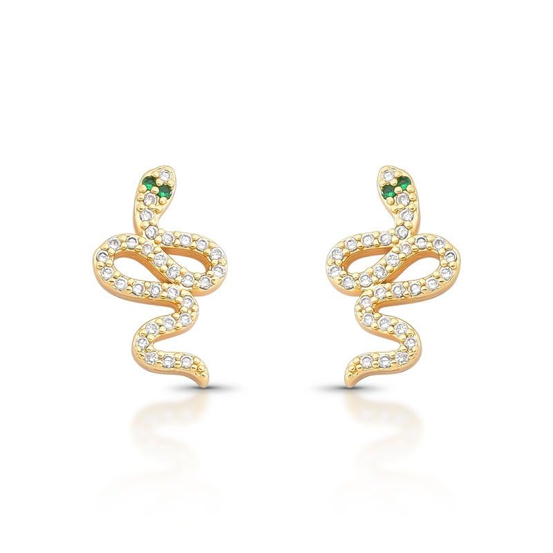 BRINCO EM FORMATO DE COBRA, BANHADO EM OURO 18K CRAVEJADO COM PEDRAS ZIRCÔNIAS WHITE E ZIRCÔNIA VERDE NOS OLHOS