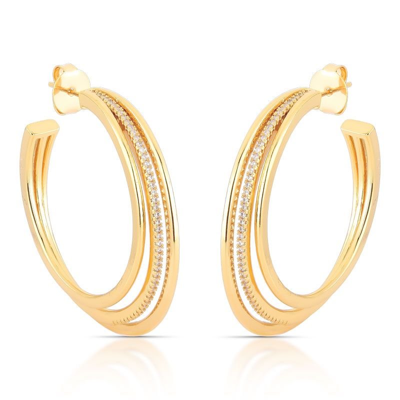 BRINCOS 03 AROS, BANHADO EM OURO 18K, SENDO DUAS LISAS E A CENTRAL CRAVEJADA COM PEDRAS ZIRCÔNIAS