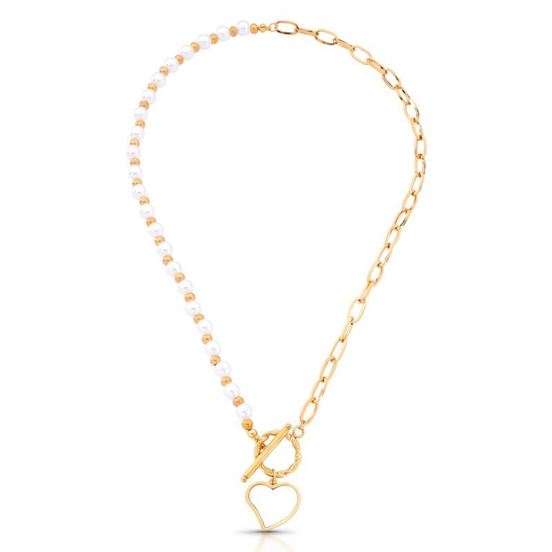COLAR ELOS DOURADO BANHADO EM OURO 18K COM PÉROLAS E PINGENTE CORAÇÃO ESMALTADO