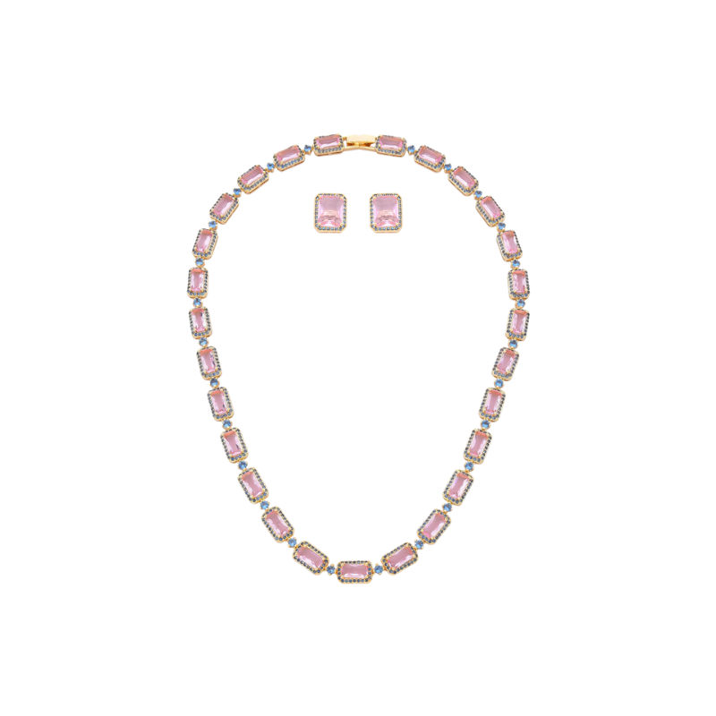 As pedras rosas e azuis representam equilíbrio entre emoção e serenidade. Este kit com colar e brinco cravejados e banhados em ouro 18K combina delicadeza, harmonia e um toque de encanto atemporal.